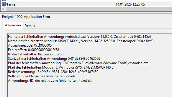 Nach dem Upgrade der VMware Tools auf Version 13 (0.1.0+) startet der „VMware Tools“ Dienst auf virtuellen Maschinen (VMs) unter Windows Server 2019 nicht mehr. Versucht man das manuell, sieht man im Anwendungs-Ereignisprotokoll die Meldung: