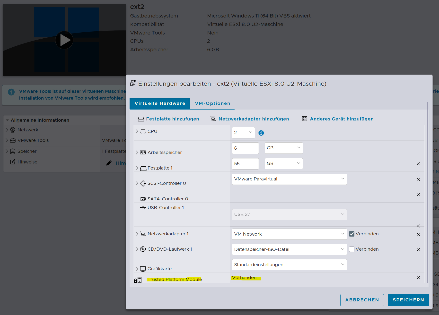 New-VMTPMKey -Operation CREATE -KeyName "windows-11-key" - Und endlich kann man das vTPM zu den VMs (jeweils einzeln) hinzufügen: